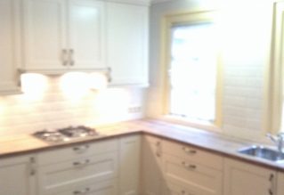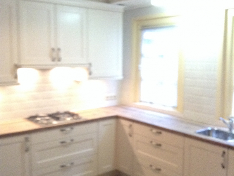 De monteur heeft de keuken netjes gemonteerd, inclusief leidingwerk en tegels geplaatst.
