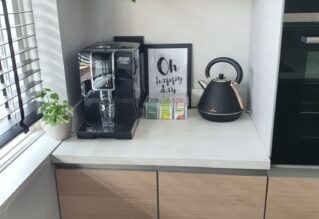 Gefeliciteerd met jullie prachtige keuken. Ik ben blij dat jullie zo tevreden zijn, het resultaat is prachtig. Het is een multifunctionele keuken, met een leuke koffiehoek en veel werkruimte. Geniet ervan!