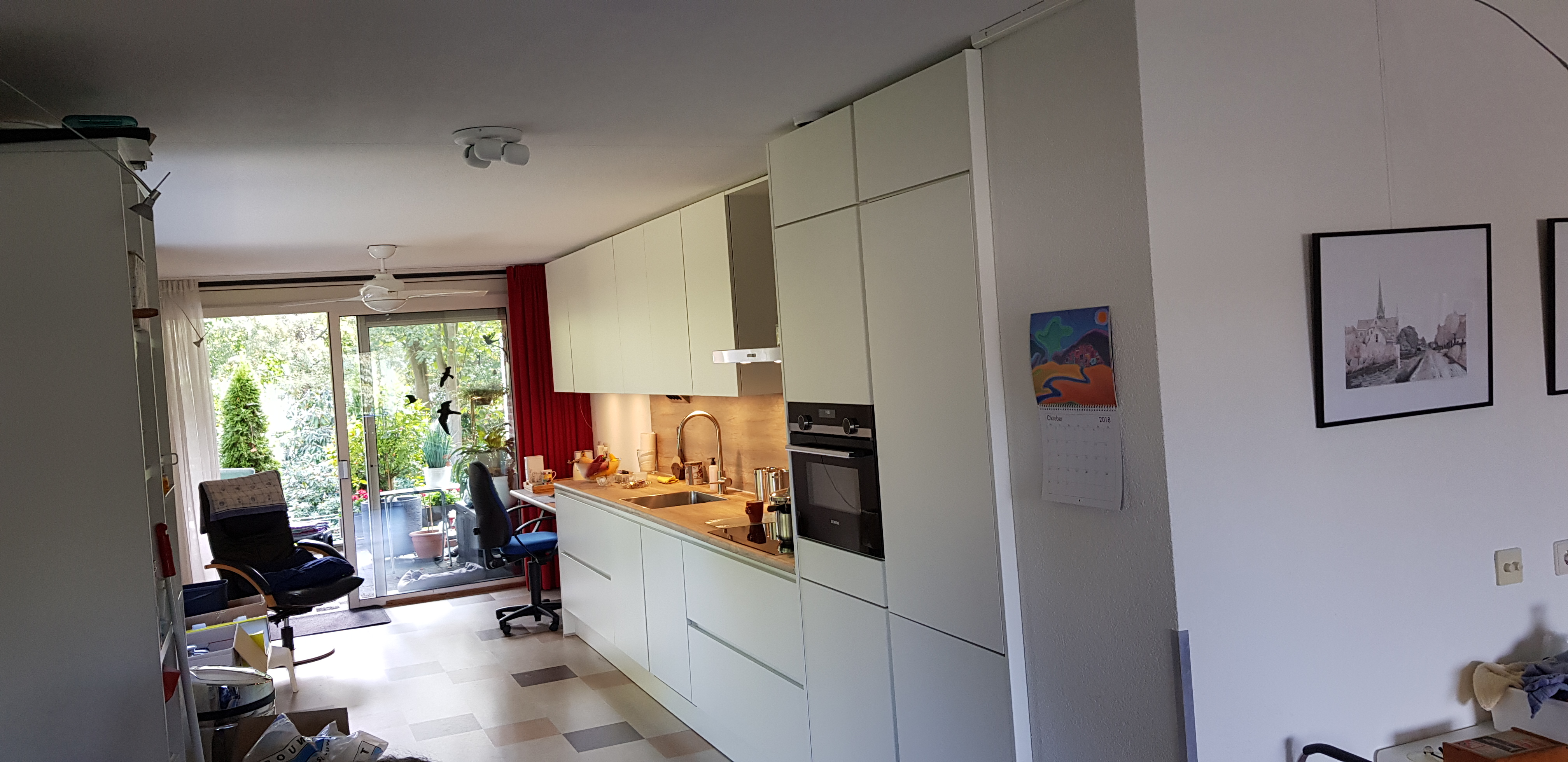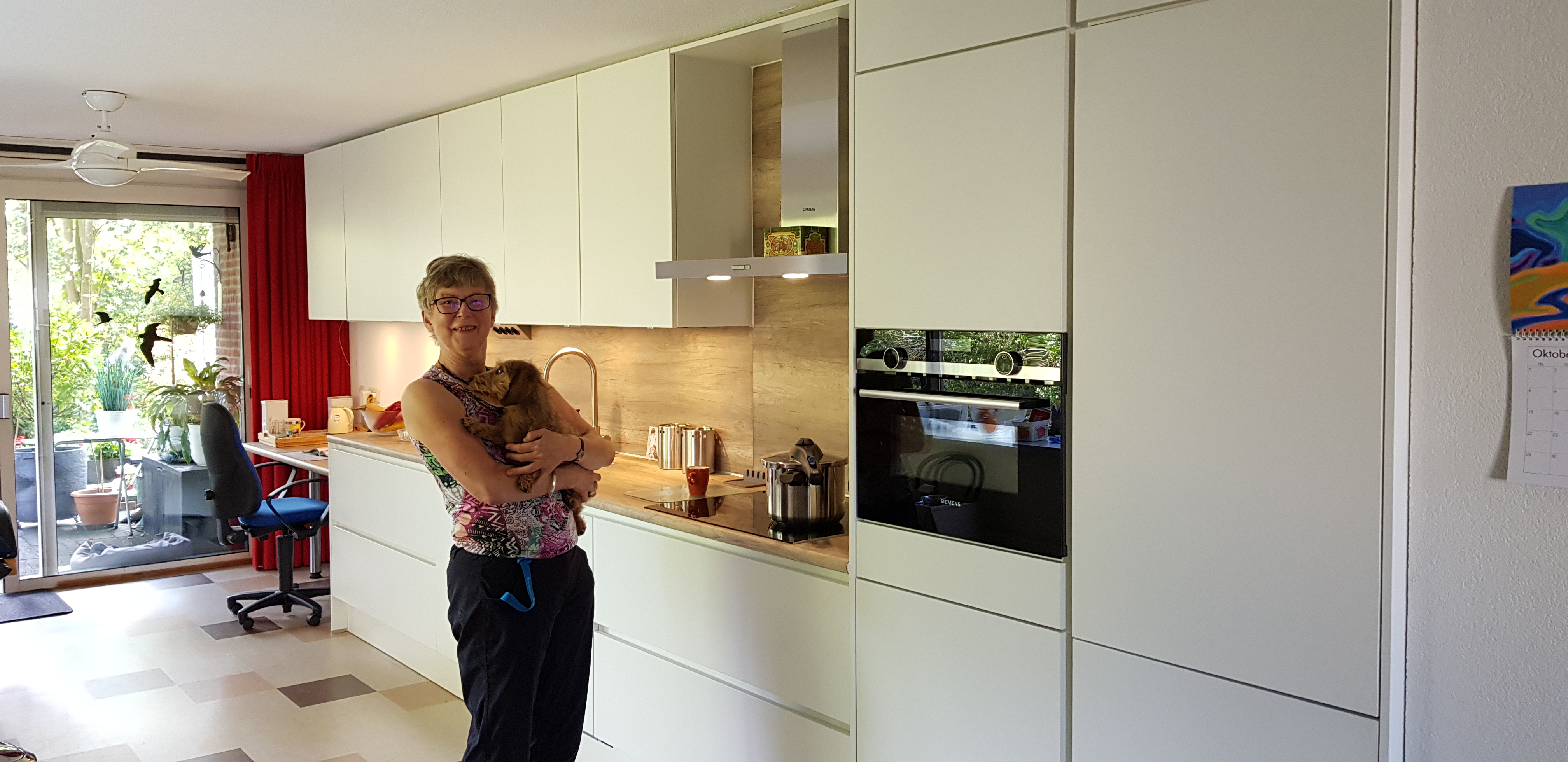 Het is een keuken geworden met heel veel opbergruimte. Ik ben nu meer in de keukenruimte doordat er een mooi bureau is geplaatst, ik ontbijt daar graag in de ochtend.