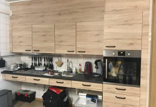 Aangezien ik zelf door persoonlijke omstandigheden niet kan komen, is Wil een paar keer bij mij thuis geweest met voorbeelden van deurtjes en werkbladen. De keuken moest een aangepaste keuken zijn waarbij er gebruik gemaakt moest worden van een bestaand ophangsysteem.