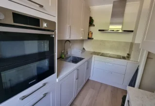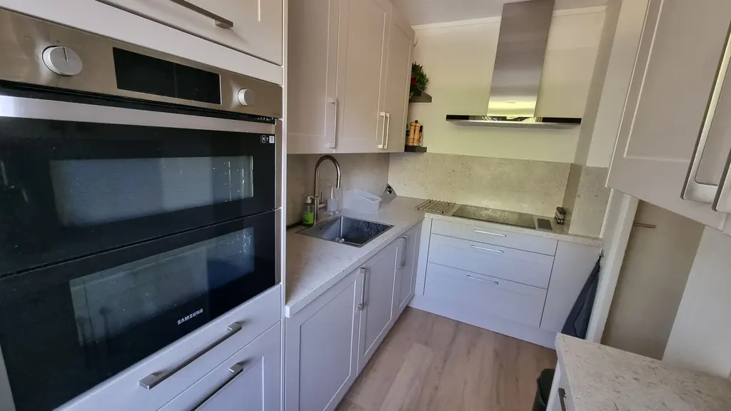 Mijn keuken wensen bestonden uit veel opbergruimte en niet alleen keukenapparatuur, maar ook de wasmachine in een niet zo grote ruimte. Het ontwerp sprak me meteen aan, vooral omdat ik het gevoel had dat er echt naar me geluisterd was. Ik kreeg goede adviezen over indeling, het optimaal benutten van de ruimte en passende combinaties van kastdeurtjes en werkblad. Dus een dikke pluim voor Jimmy! De montage verliep vlekkeloos, geen beschadigde kastjes of verkeerde maatvoeringen. Er was alleen 1 verkeerde stekkerdoos geleverd (dat werd snel opgelost). Inmiddels heb ik de keuken nu bijna anderhalve maand naar volle tevredenheid in gebruik.