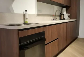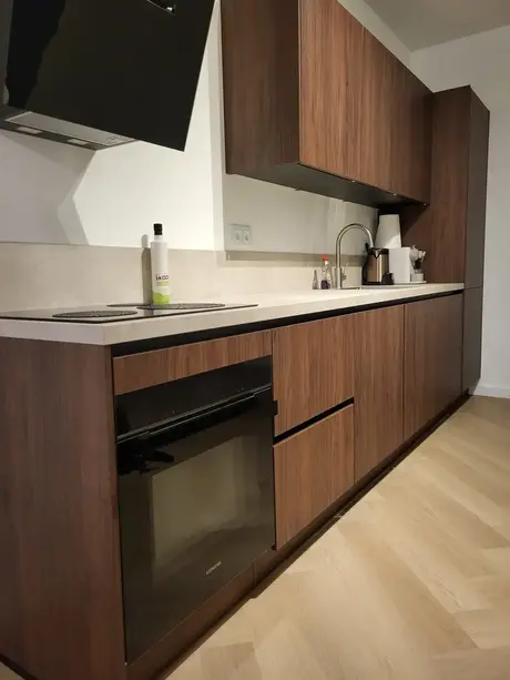 Goed om te horen dat jullie tevreden zijn over onze service. De keuken is een strakke, moderne keuken met een warme, houtachtige afwerking. De kastdeuren en lades hebben een rijke, donkerbruine kleur die een tijdloze en stijlvolle uitstraling geeft. Heel mooi dus om te combineren met het lichtkleurige aanrechtblad. Veel plezier met deze prachtige keuken!