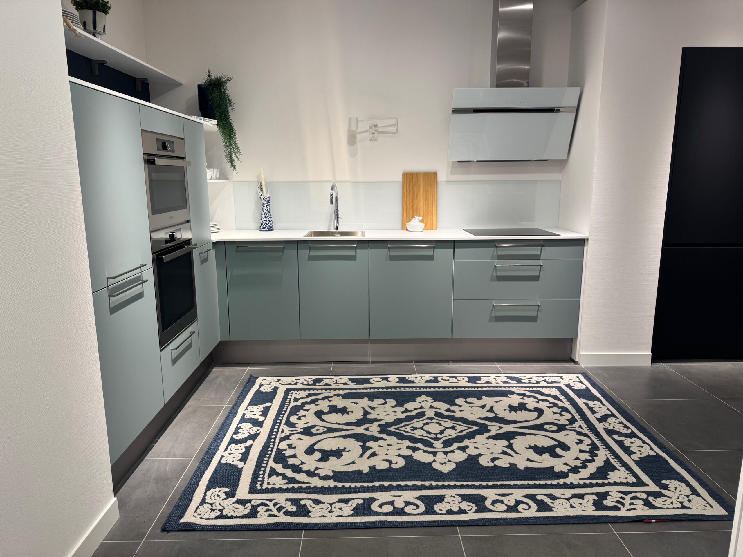 Deze aqua kleurige Nobilia hoekkeuken heeft half hoge kasten in combinatie met een wit werkblad. De grepen en ingebouwde Whirlpool apparatuur zorgen voor een strakke uitstraling. De keuken oogt fris en modern.
