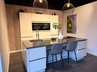 Mooie witte hoogglans keuken van het Duitse topmerk Nobilia met een composiet werkblad. Voorzien van Siemens keukenapparatuur en een Pelgrim kookplaat met geintegreerde afzuiging.