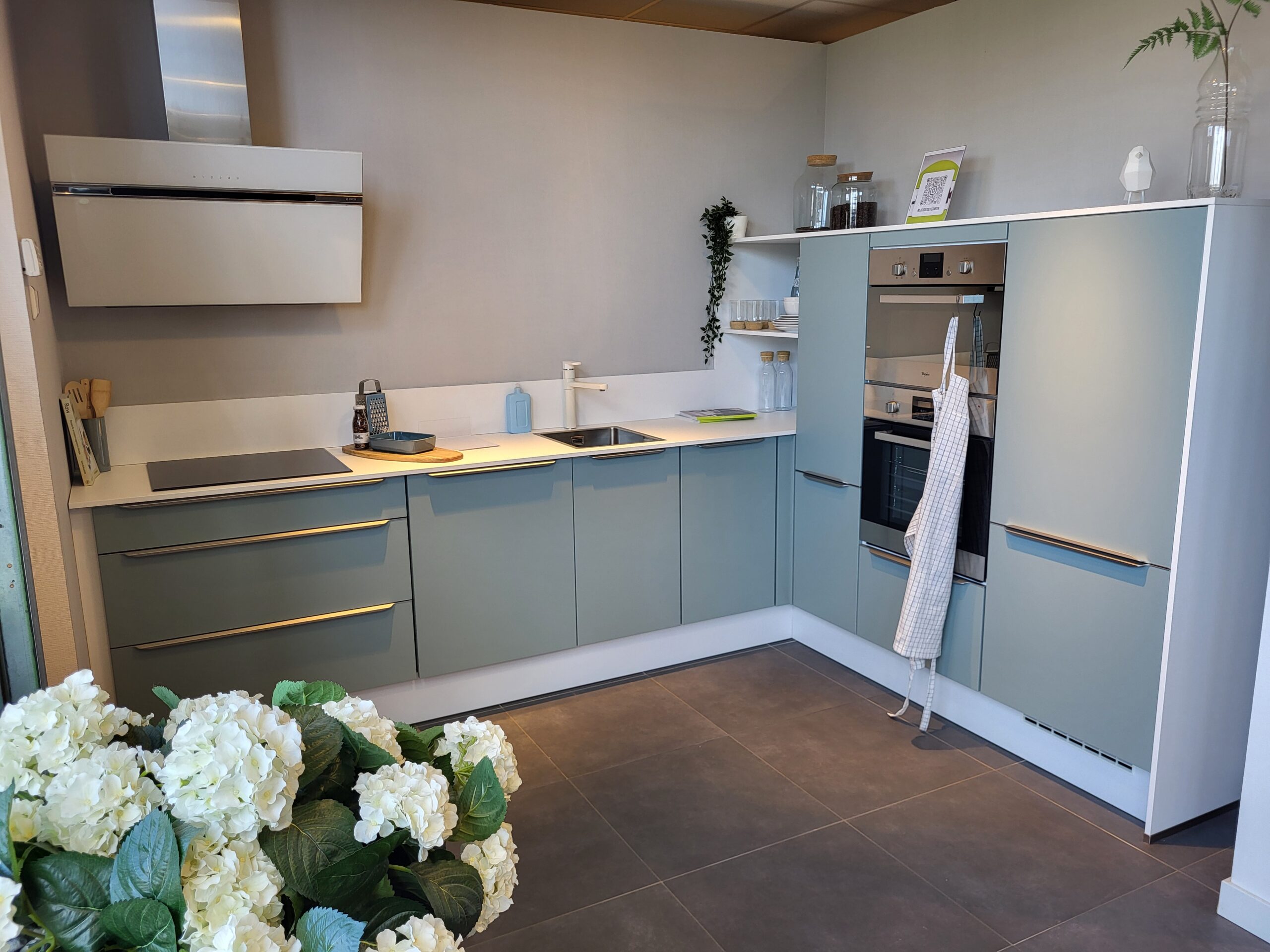 WEGENS VERBOUWING AANGEBODEN: Moderne keuken van het Duitse topmerk Nobilia met complete Wirlpool keukenapparatuur. De keuken is voorzien van een luxe draaiplateau in de hoekkast, brede lades en brede apothekers kast voor extra opberruimte.