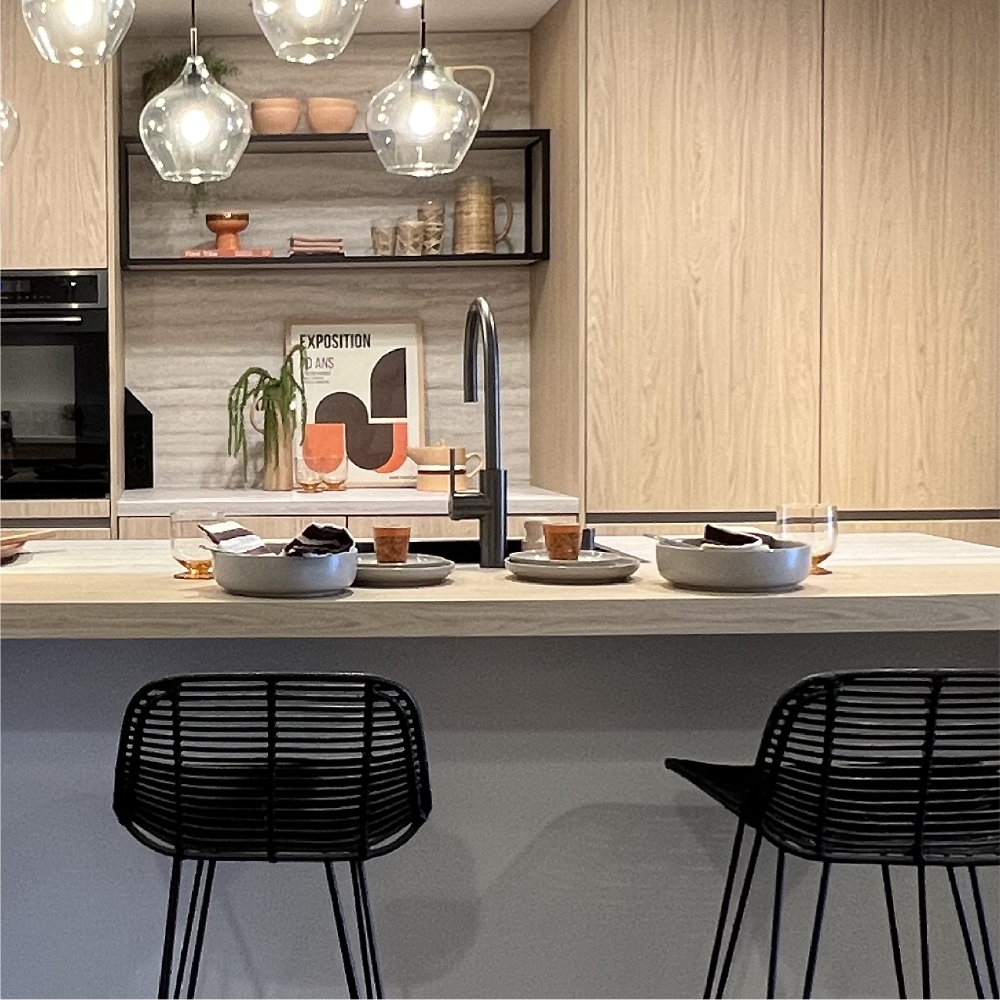 Keuken kijkje: De Japandi keuken kastenwand en bar blad hebben de houtlook kleur Eiken Como. Dit is prachtig gecombineerd met het travertin zandgrijs decor van het kookeiland werkblad, het blad in de koffienis en de achterwand.