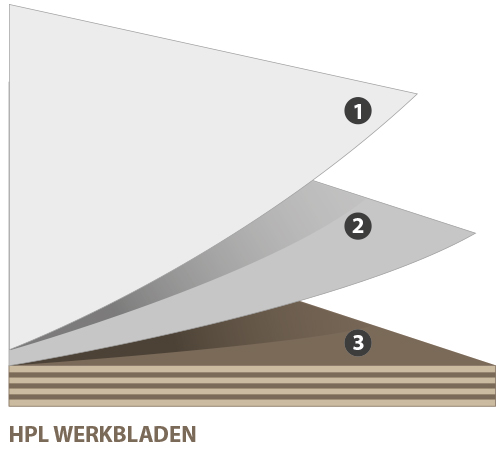- De bovenlaag is een harde transparante kunstharslaag (melamine).